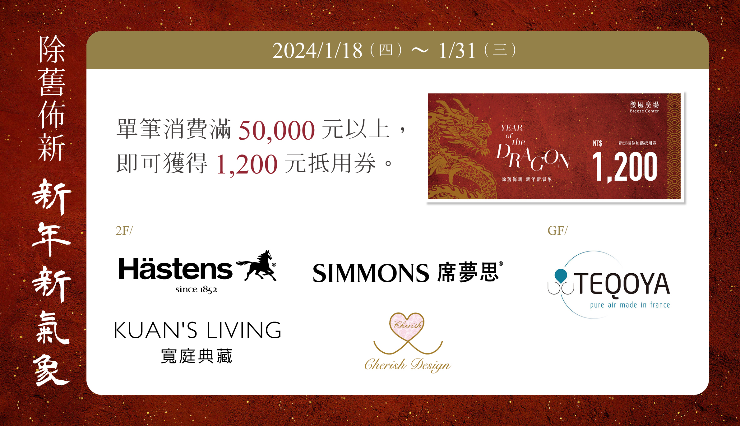 活動內容|憑微風積點禮遇會員資格,於指定櫃位購買家電、寢具,單筆消費滿50,000元以上,即可獲得1,200元抵用券。