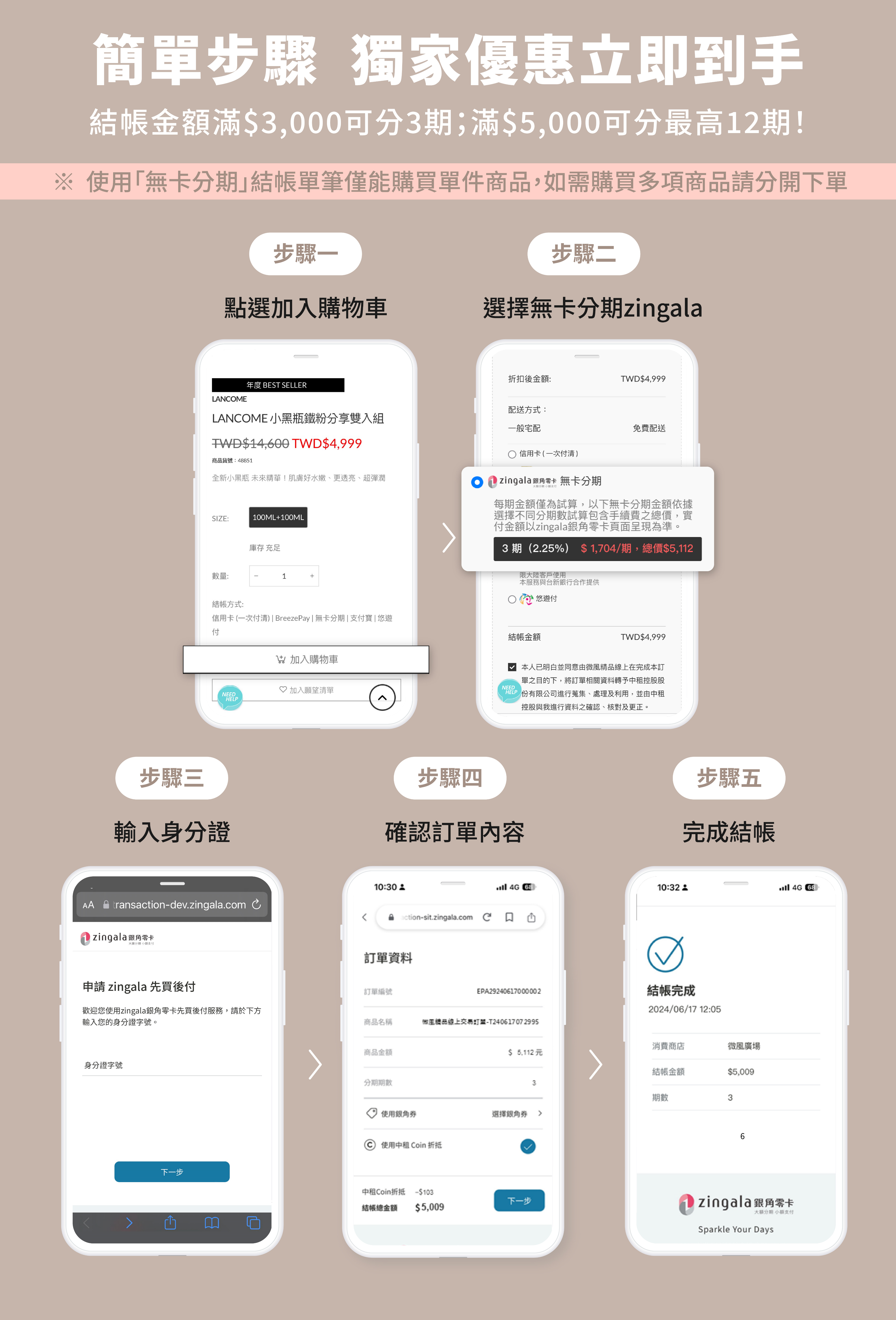 1.於 BREEZEONLINE 使用 zingala 銀角零卡「無卡分期」結帳單筆僅能購買單件商品,如需購買多項商品請分開下單;結帳金額滿 NT$3,000 可分 3 期,滿 NT$5,000 即可分 3/6/10/12 期。