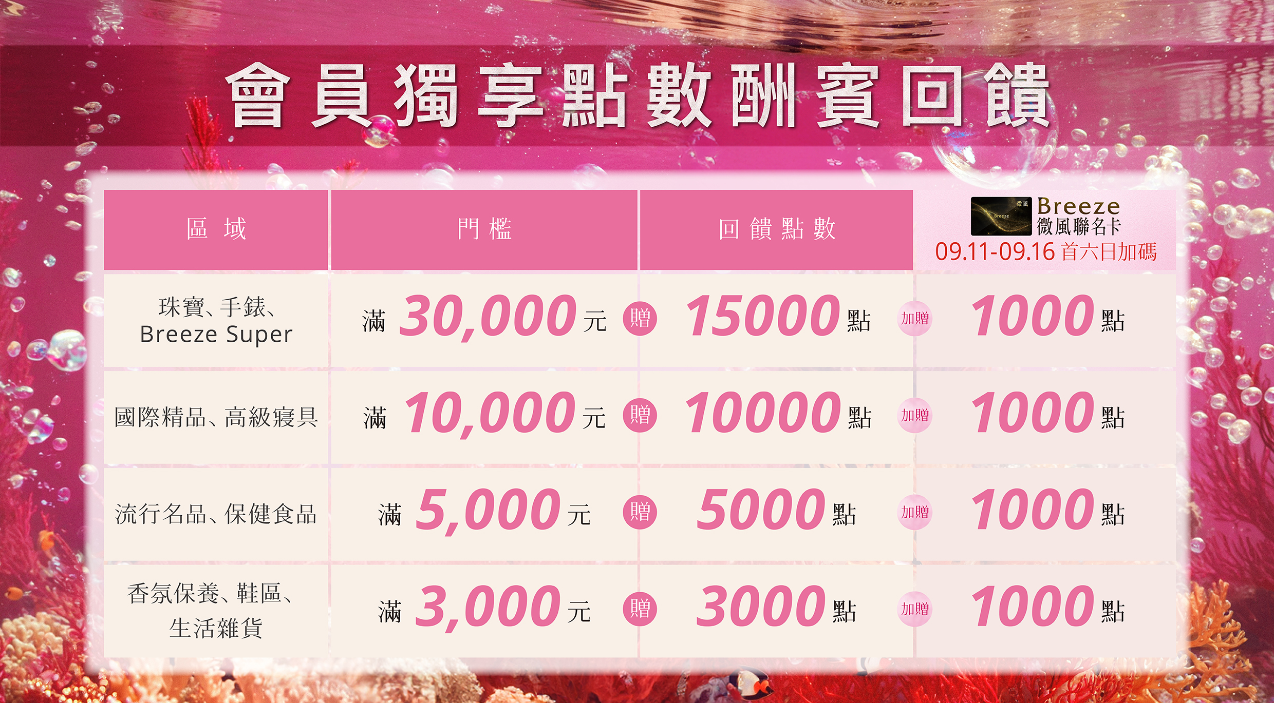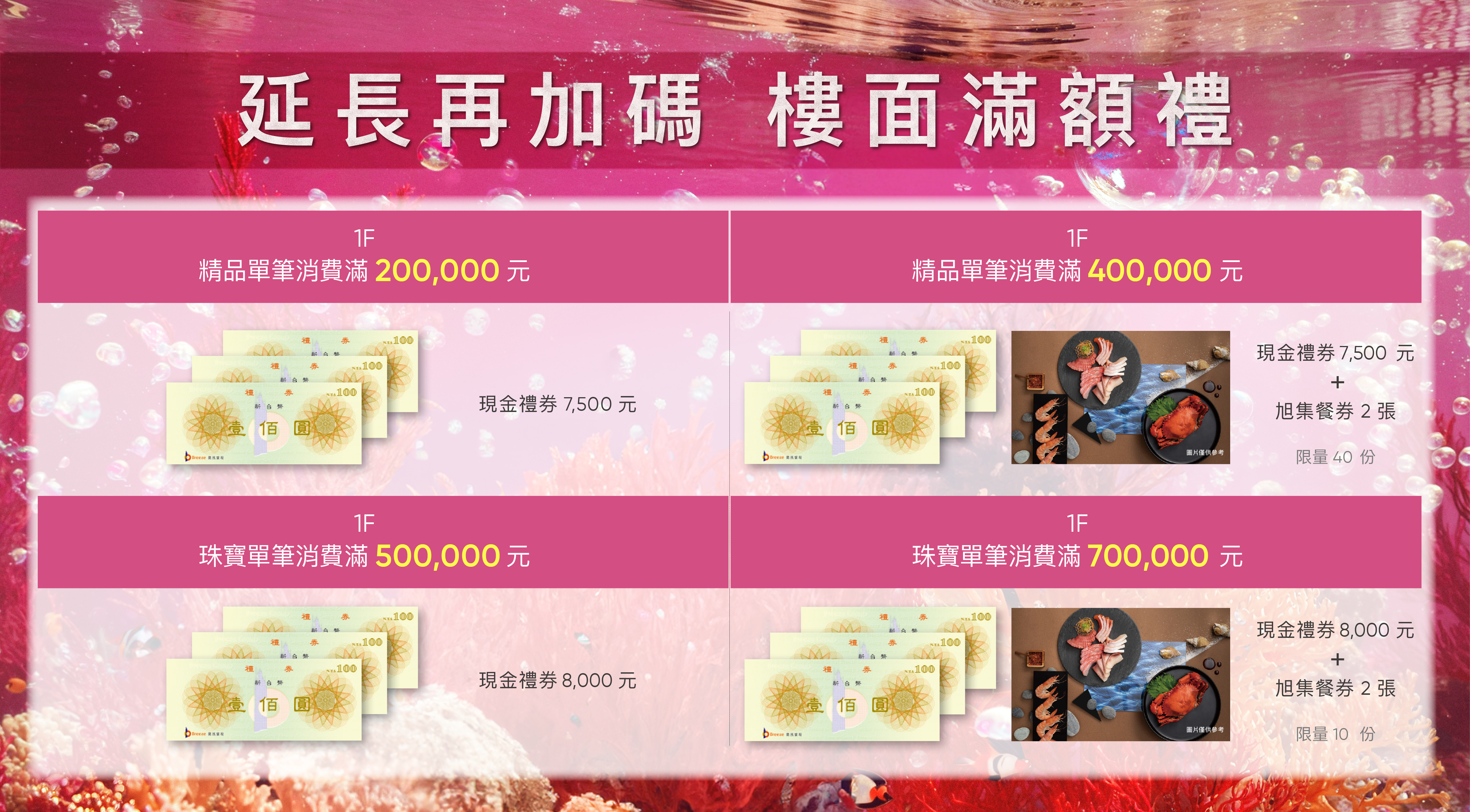 活動期間,憑微風積點禮遇會員,於GF、1F-2F專櫃單筆消費達指定門檻,即可兌換「樓面滿額禮」乙份。