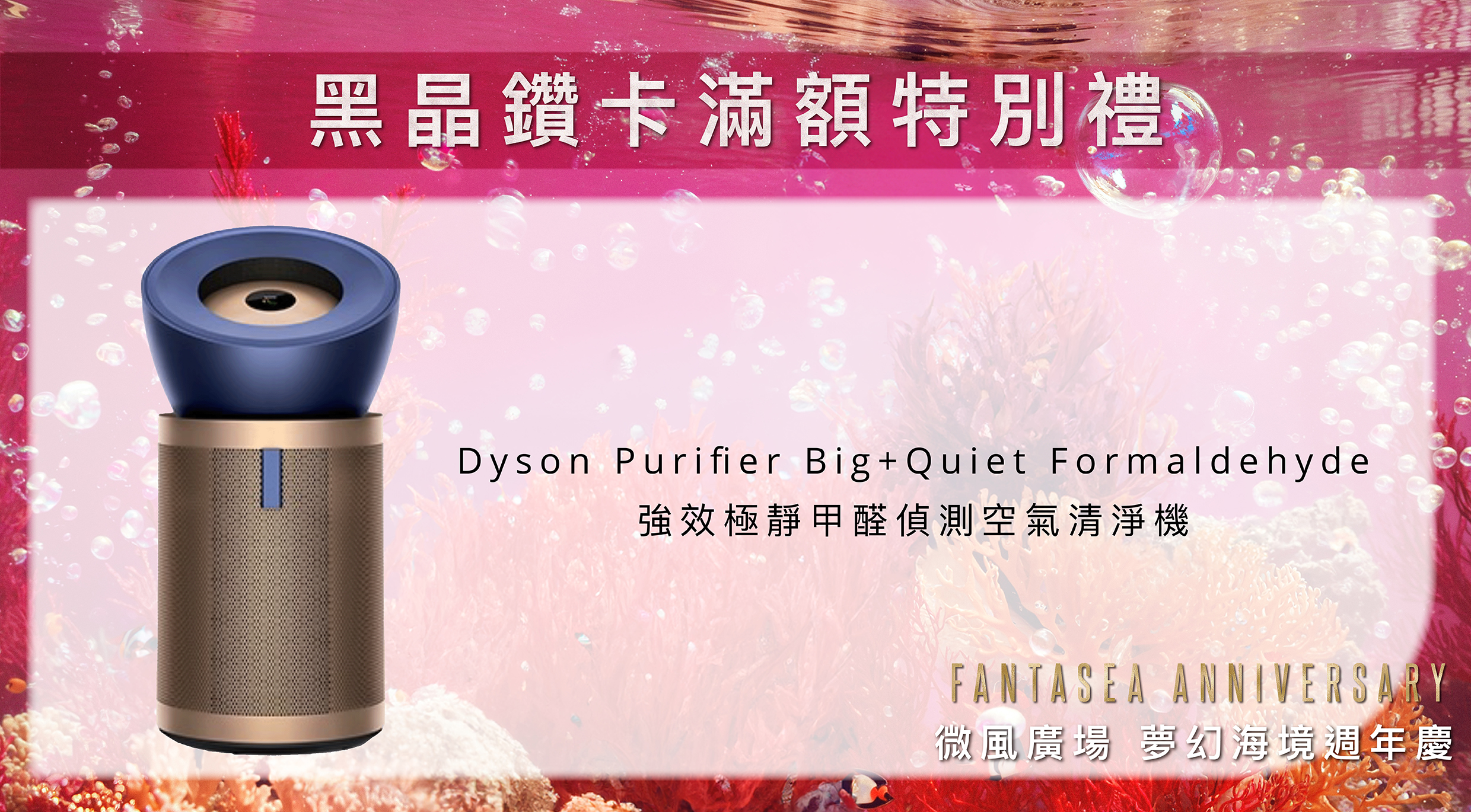 活動期間內,憑微風積點禮遇會員刷微風黑鑽卡、晶鑽卡,當日當館累積消費達3,000,000元,贈滿額禮「Dyson Purifier Big+Quiet Formaldehyde強效極靜甲醛偵測空氣清淨機」乙台。