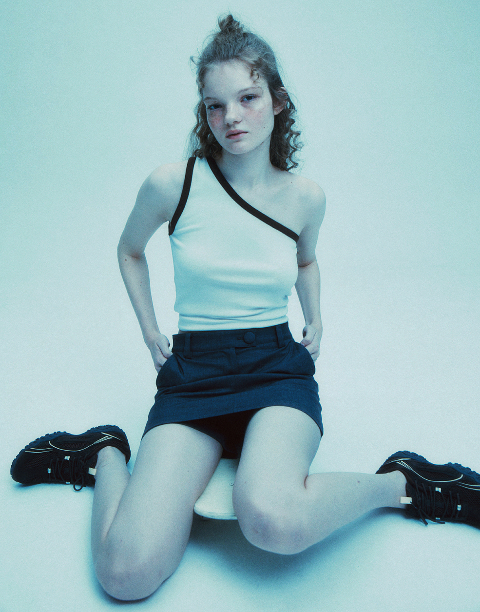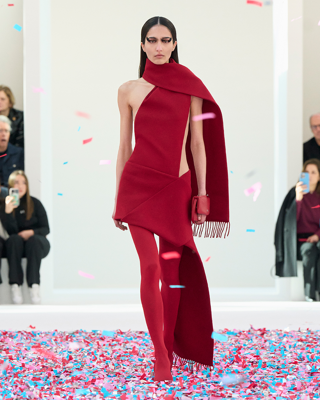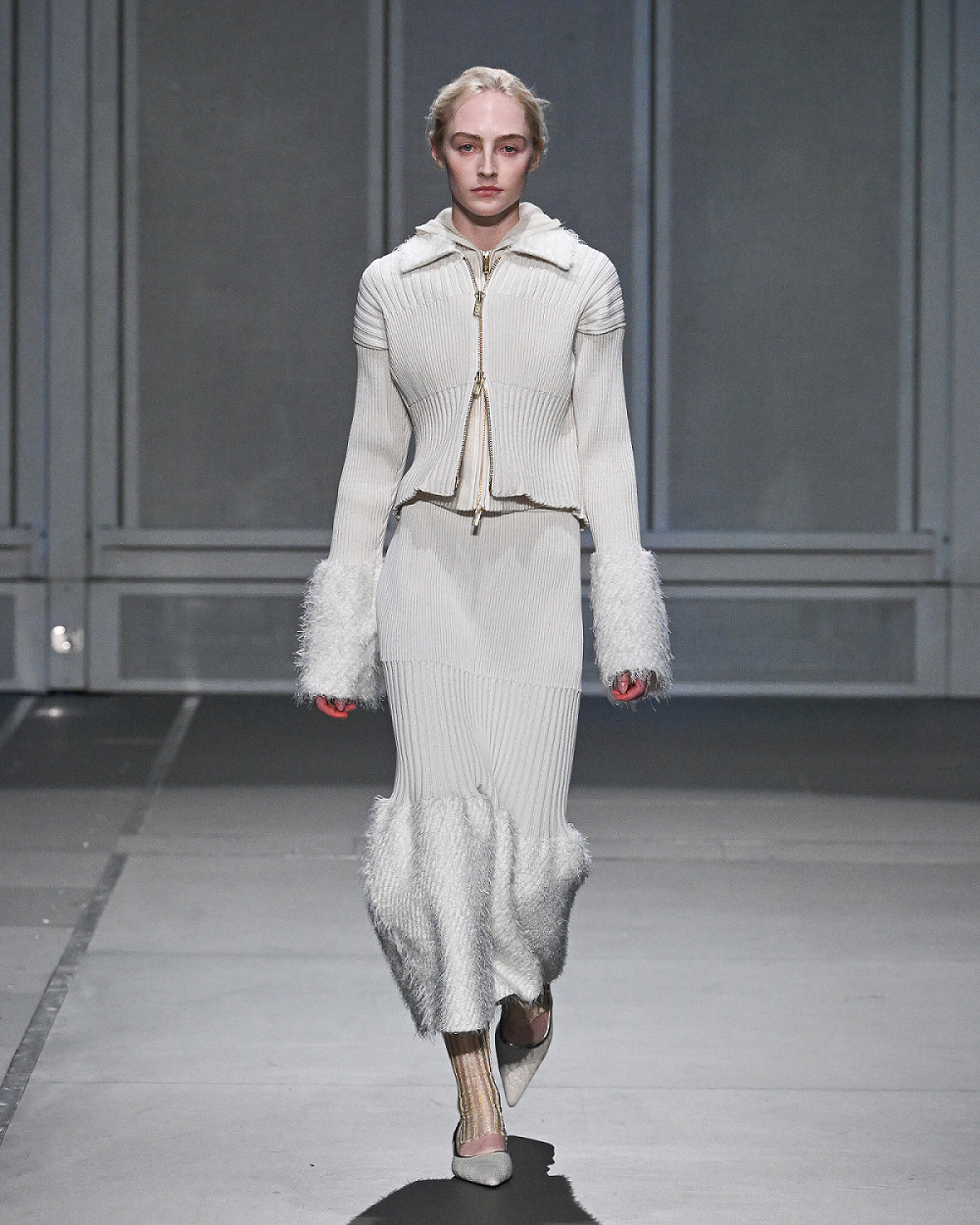2025秋冬系列通過對courrèges經典款式的重新詮釋—梯形迷你裙、吊帶背心、機車夾克—以傾斜的角度和不對稱的閉合設計,打破了傳統廓形的平衡,賦予其全新的生命力。