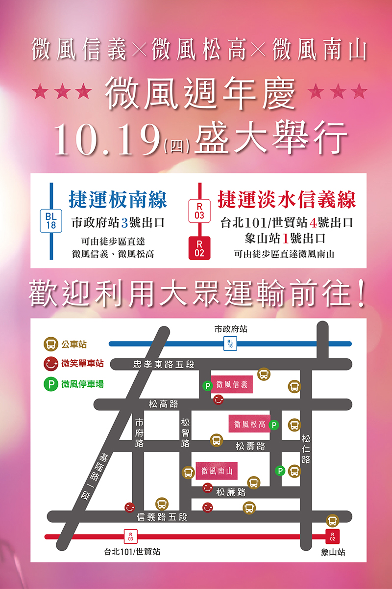 探索微風 ﹥ 最新消息 ﹥ 會員專屬本活動已結束【PINK-TASTIC ANNIVERSARY寵粉時尚週年慶】交通資訊2023.10.04微風松高微風信義微風南山活動時間|2023.10.05(四) 至 11.06(一) 注意事項| 為有效紓緩信義區週邊百貨周年慶交通,請大家多多利用大眾交通運輸工具前往微風信義、微風松高、微風南山喔,享受購物樂趣的同時,也別忘了節能減碳愛地球 延伸閱讀微風黑鑽/晶鑽卡尊榮上市微風慈善基金會2026「警警相依 公益寫真月曆」義賣活動即將登場!微風 x 馥蘭朵.馥森集團 用點數輕鬆換取極致享受!微風會員資訊安全通知